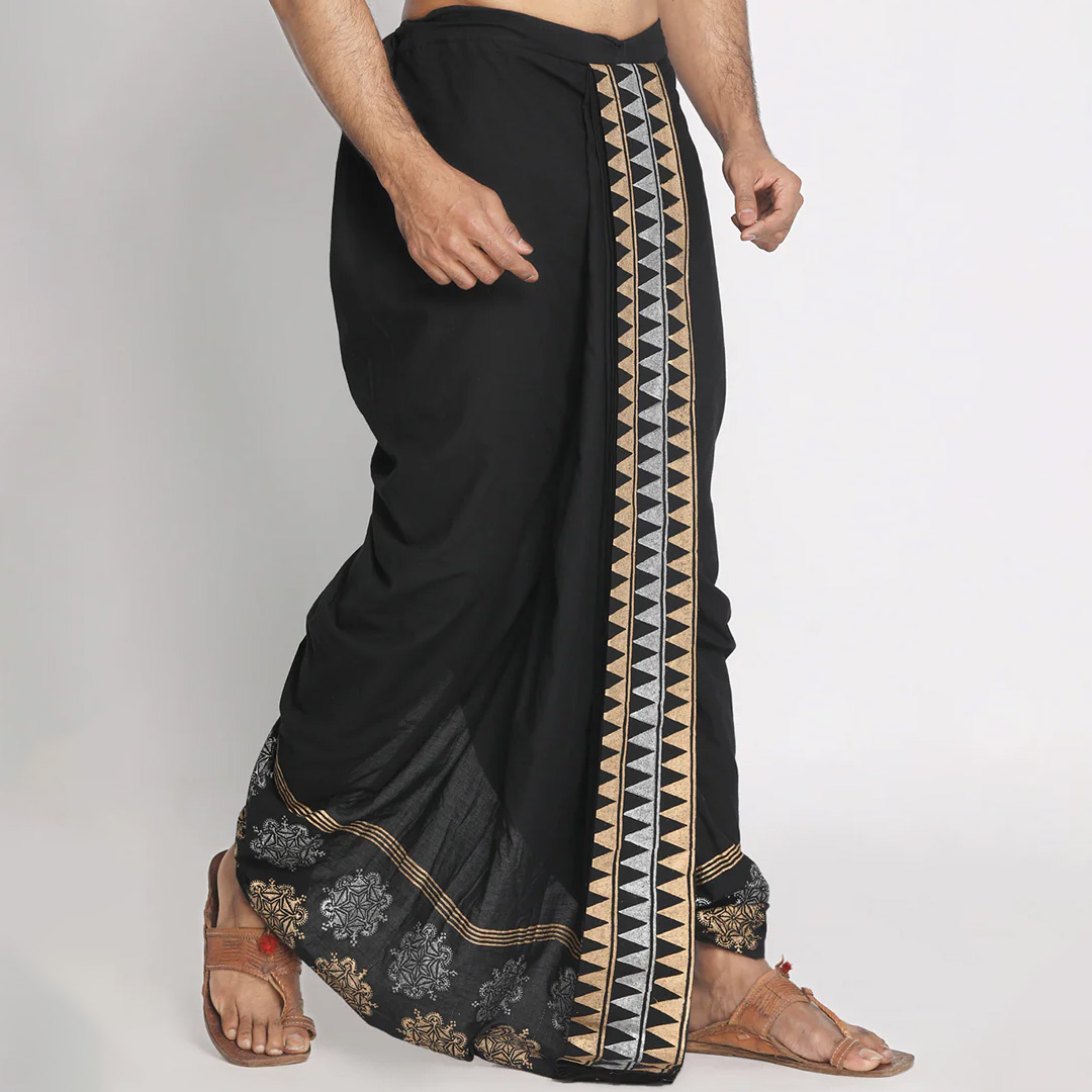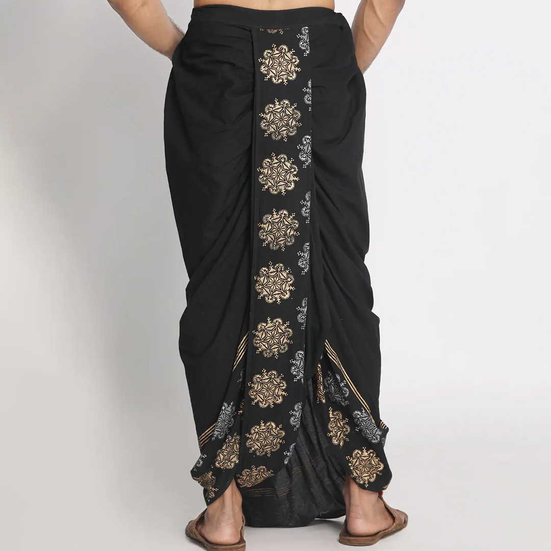 get traditionally stylish with this black pure cotton geometric pattern handblock print dhoti. featuring front and back pleats and drawstring details. dhoti is the traditional attire for men across india. it is often misinterpreted with lungi or loongi, but is a different attire.
