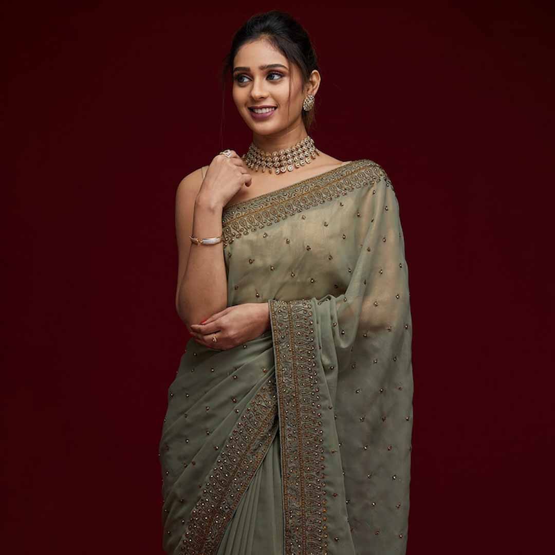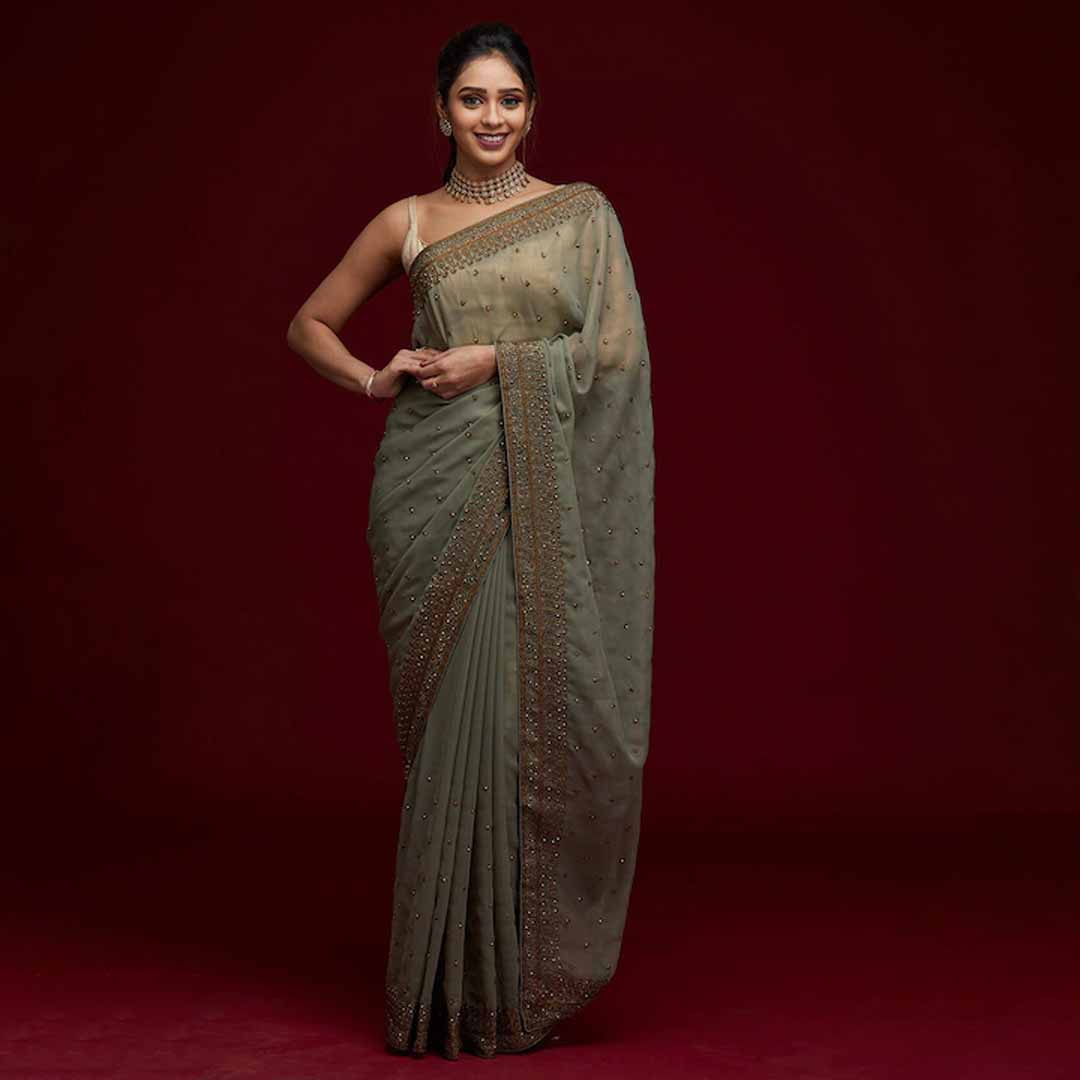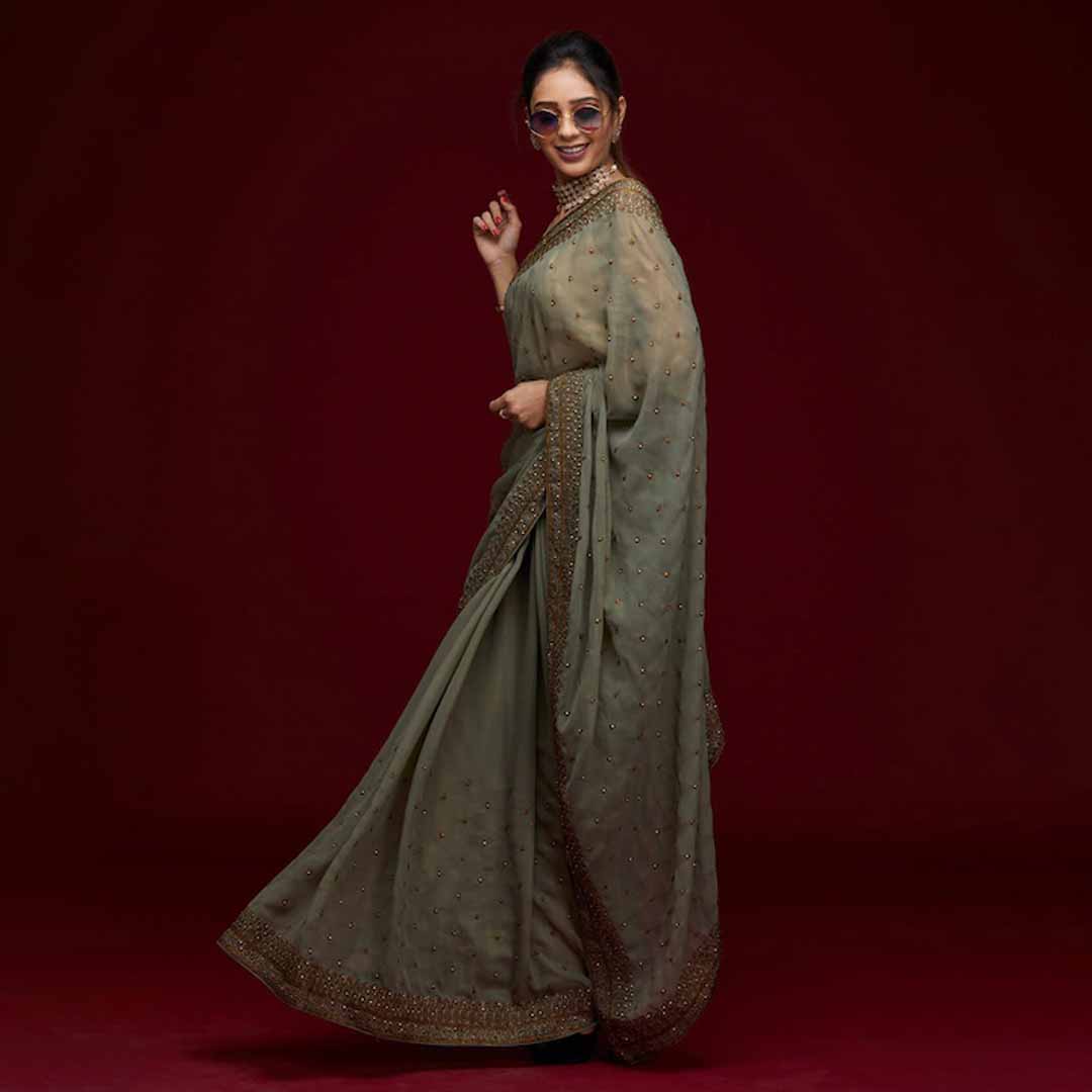 Design Details Green and gold-toned saree Floral embroidered saree with embroidered border Has embroidered detail