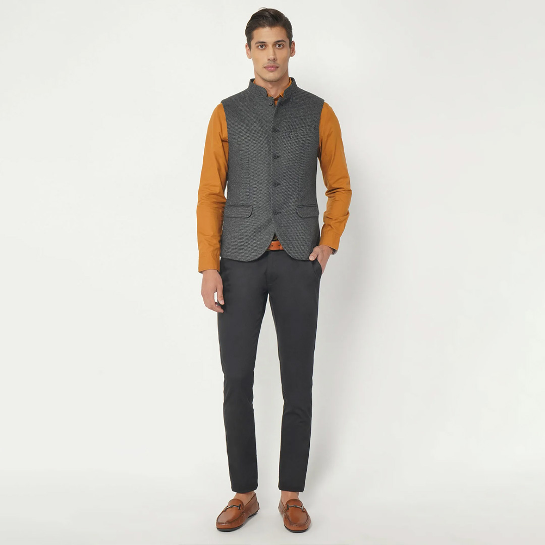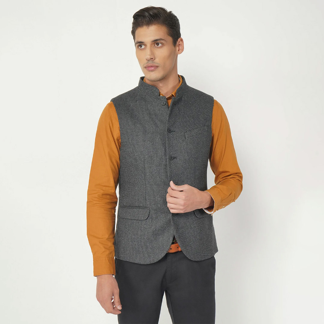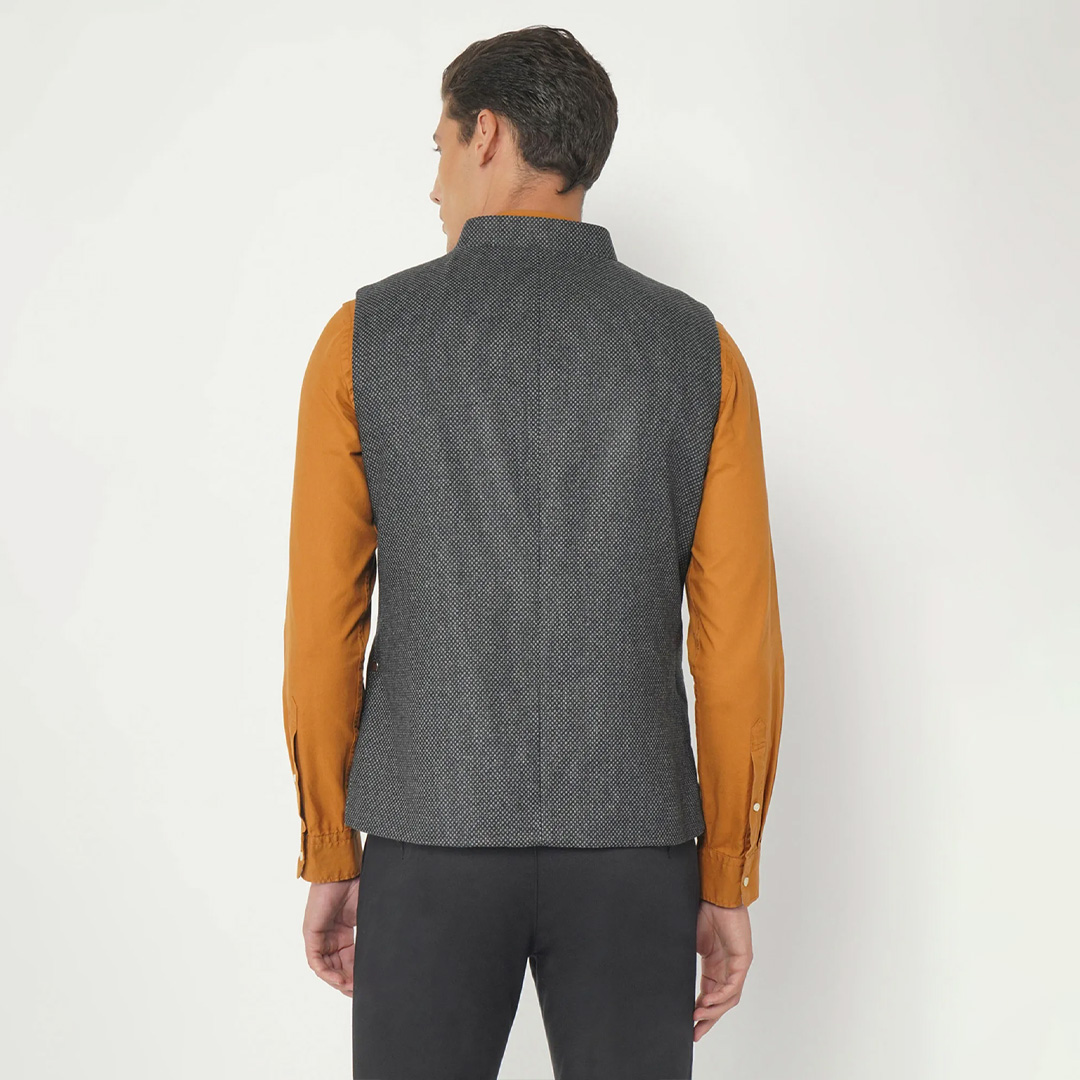 Enhance your dressing style with this stylish grey jacket from Blackberry. It is crafted in the finest material, this piece features a mandarin neck, sleeveless, and button fly closure. This piece will go best with trousers and shoes to complement the look.