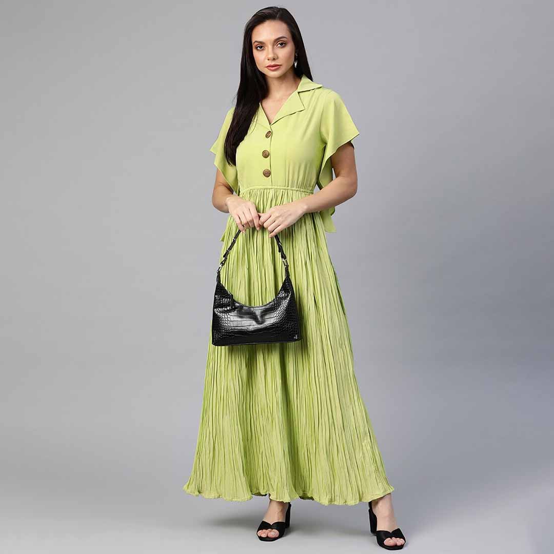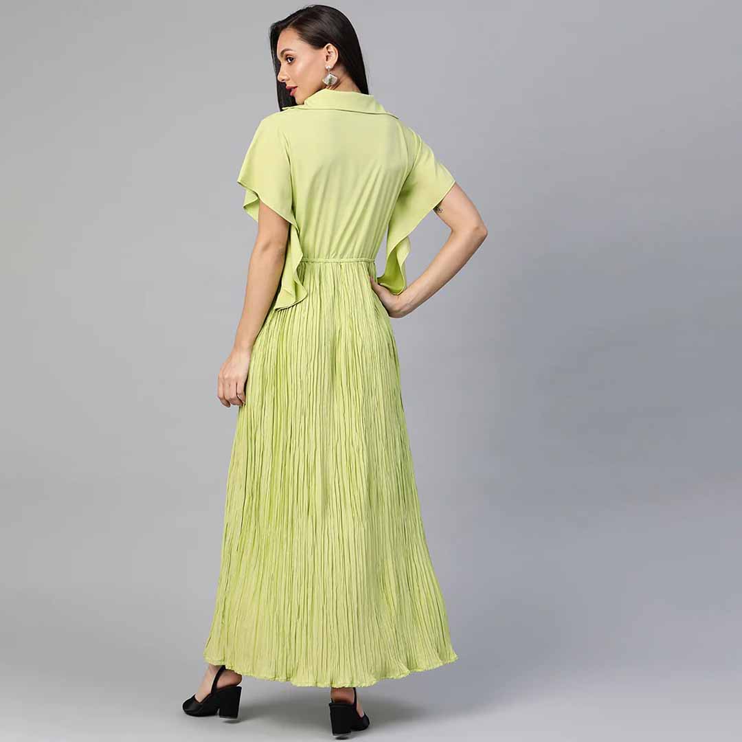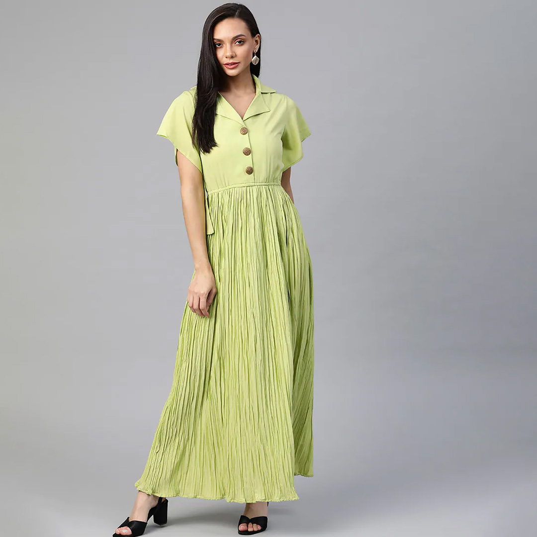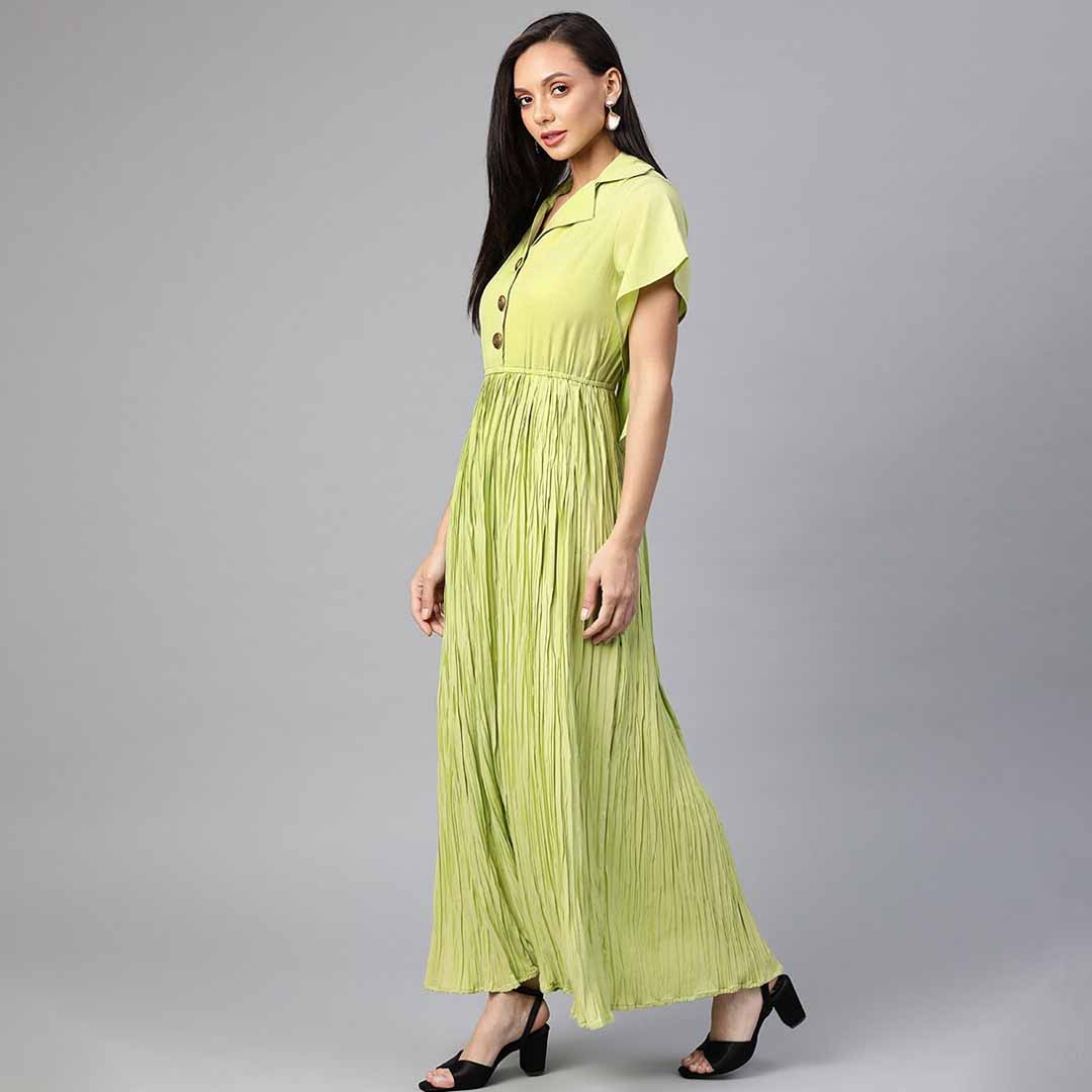 lapel neck solid maxi dress looking for some awesome collection of dresses? well, lay your hands on this dress and also get the option of choosing from green colour. dress up in a soothing pattern and don this dress made of crepe material.