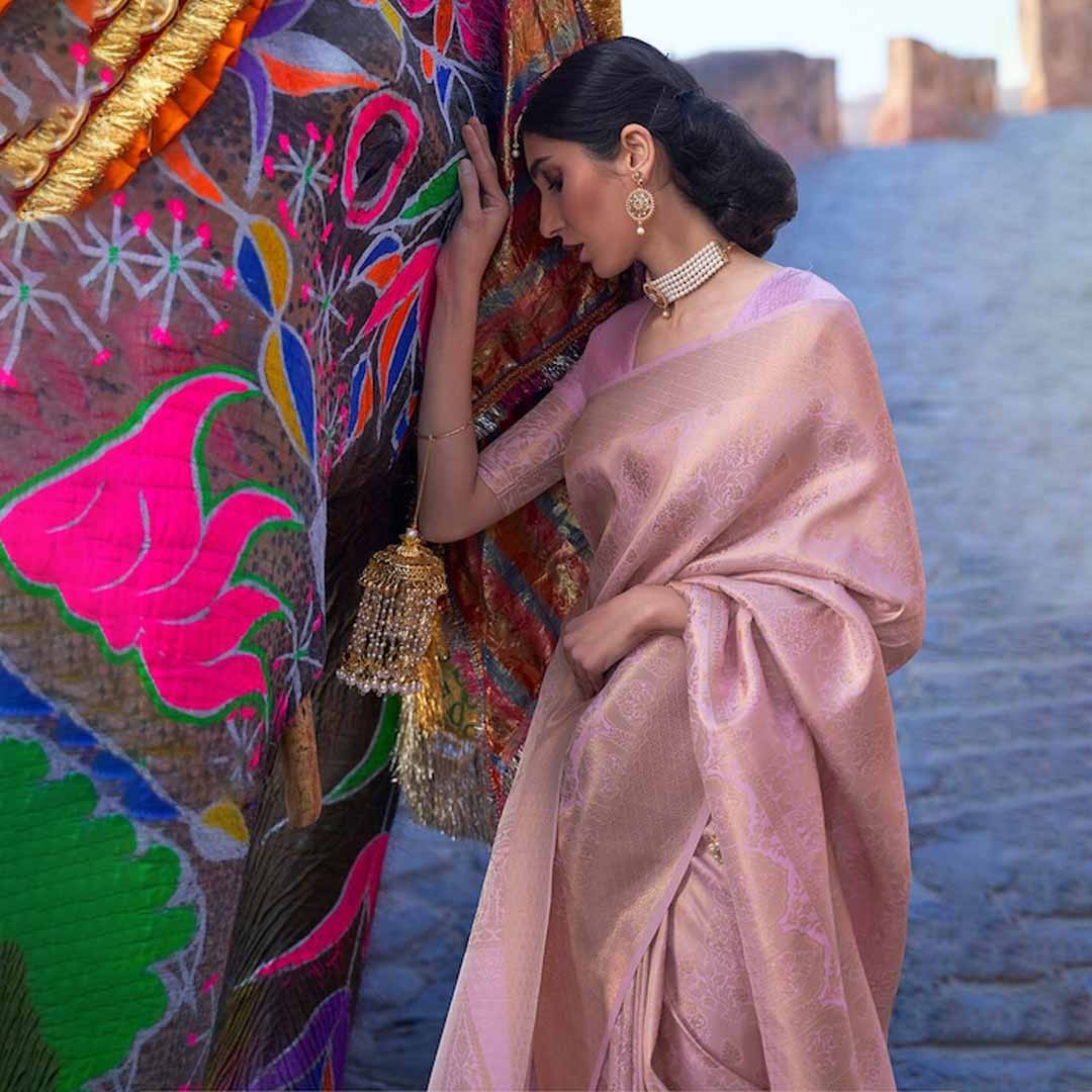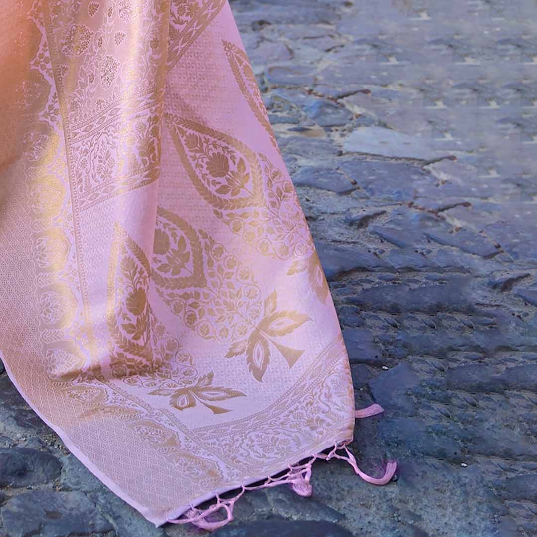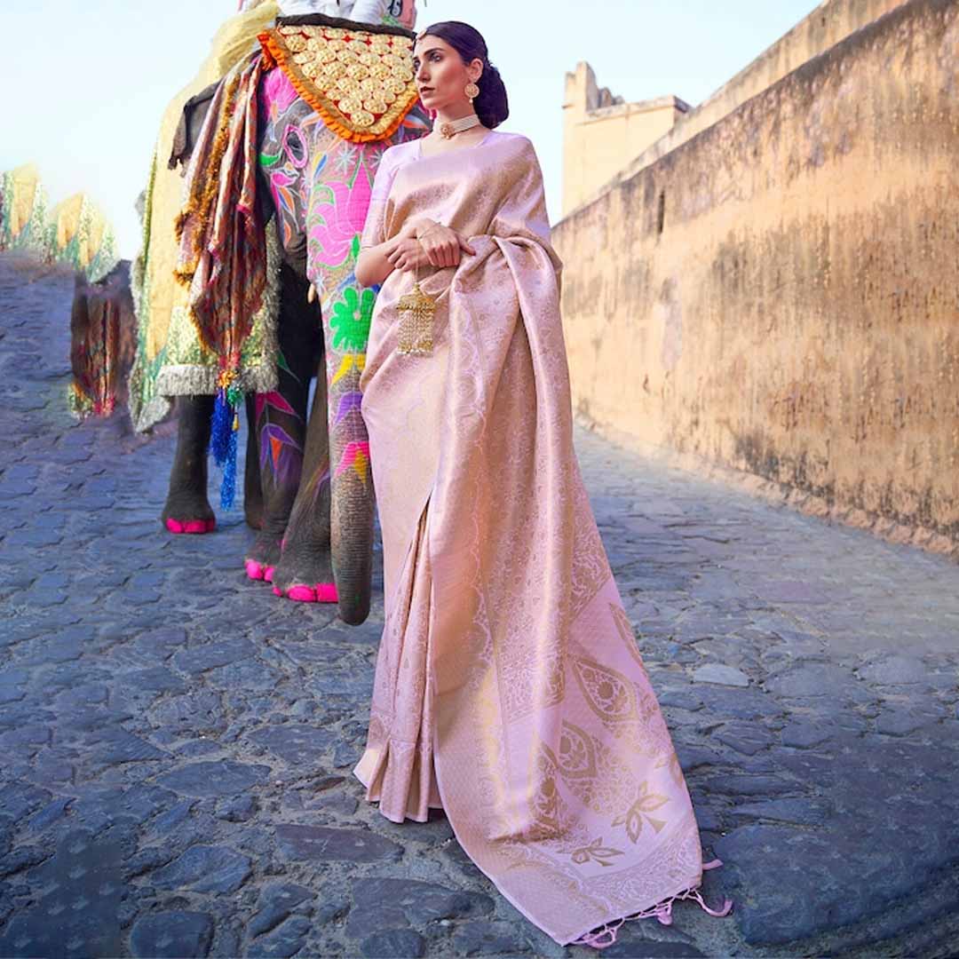 Lavender and gold-toned banarasi saree Woven design woven design saree with woven design border Has zari detail