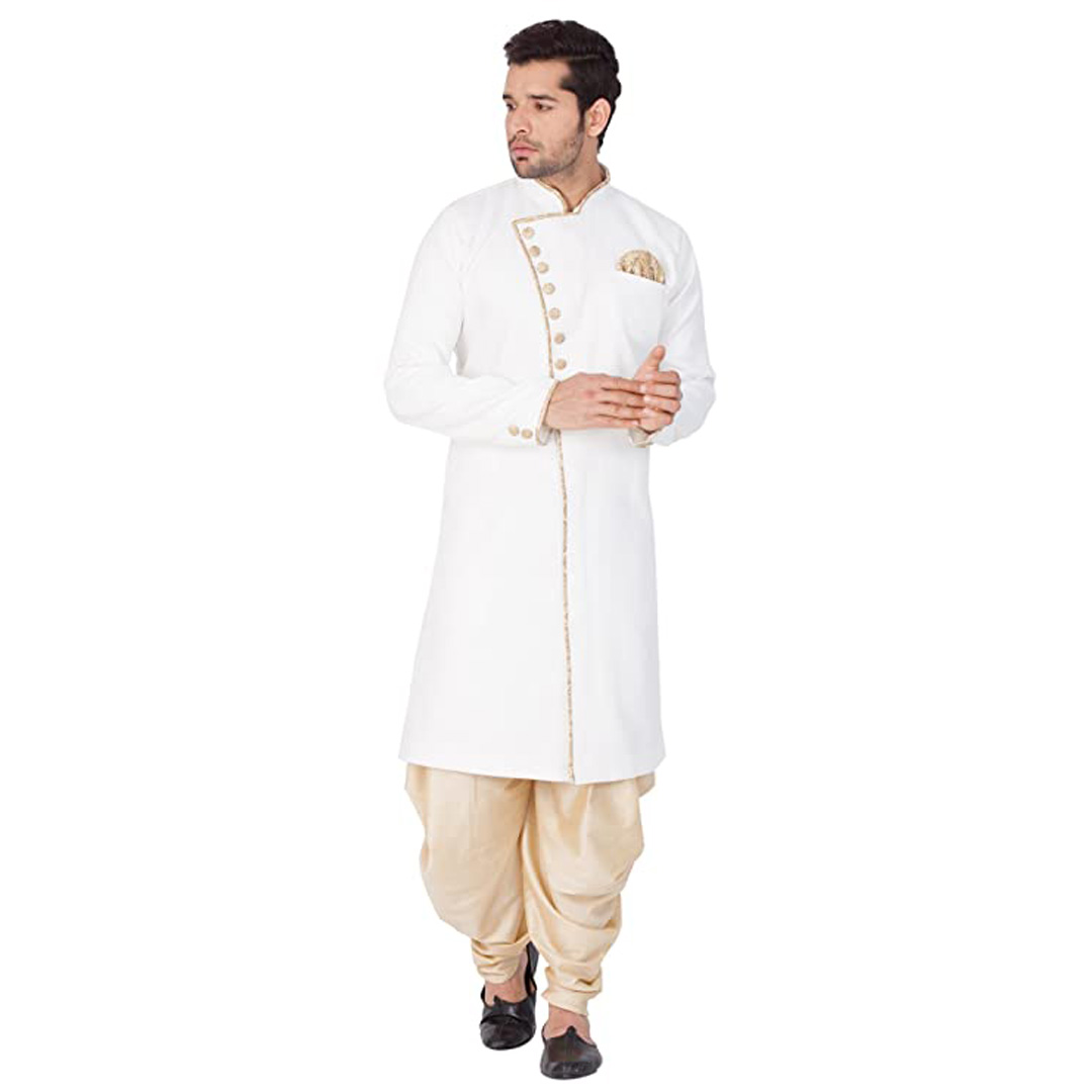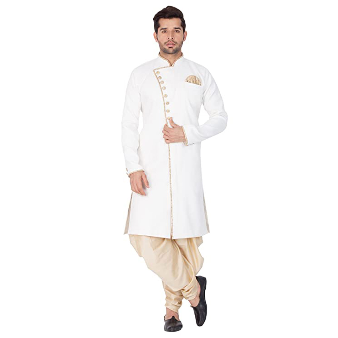 Product Details: We introduces to you these classy sherwani for men stylish latest design in variety of material and designs for all occassions. This fabric has been designed keeping in mind the latest trends in a semi formal fashion or occassional fashion. Engineering garments which fit all body types and style is our aim. We offer not just servani for man for wedding but also indo western for men and semi sherwani as well covering the entire space. Our servani are constructed in such a way that you can adorn it with a churidar, dhoti for men or a patiala too. To complete the look adorn a mojari or jutti slippers for men stylish, you may also try an authentic Kohlapuri chappal for men, the fashionistas and millennial folks may experiment with a brogues or oxfords juta for men stylish. Suitable for: Party, Weddings, Regular Wear, Celebrations, Occasions, Festivals, Lohri, Pongal, Makar Sakranti, Baisakhi, Holi, Eid, Raksha Bandhan, Dussehra, Diwali, Navratri, Pooja, Christmas, Onam, Ganesh Chaturthi, Janmasthmi and Gifts for Mens. SIZE:The above mentioned model is wearing the size of "L" WASH AND CARE: Dry Clean Only FIT TYPE: Regular Fit
