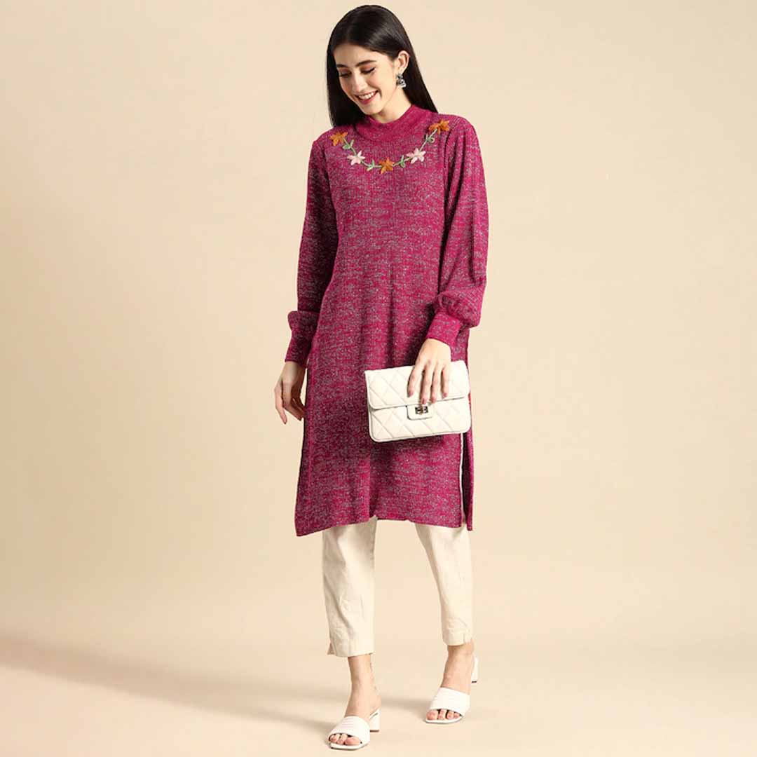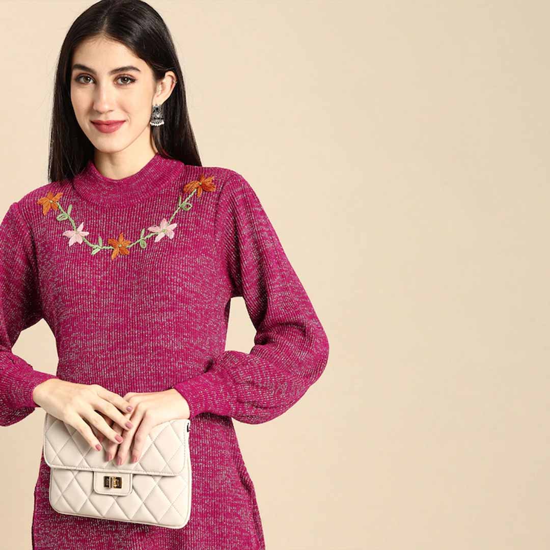 Colour: magenta Floral embroidered Round neck Long, puff sleeves A-line shape with regular style Knee length with straight hem Machine weave regular woollen