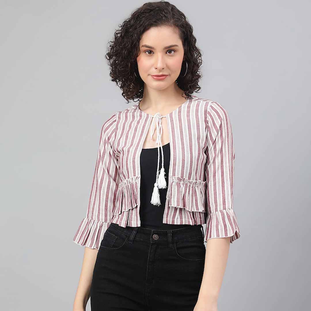 Peach-coloured and white striped open front crop shrug ,has three-quarter sleeves, gathers detail, high-low hem